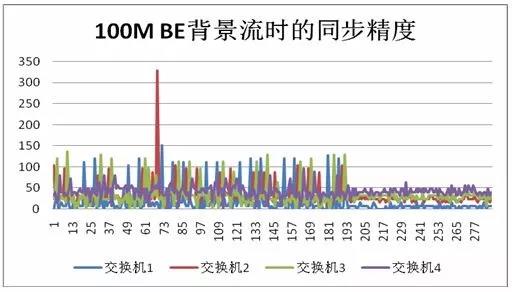 通过测试仪可以向TSN网络中注入背景流。在10M和100M背景流下,TSN交换机之间的同步如图3和图4所示。
